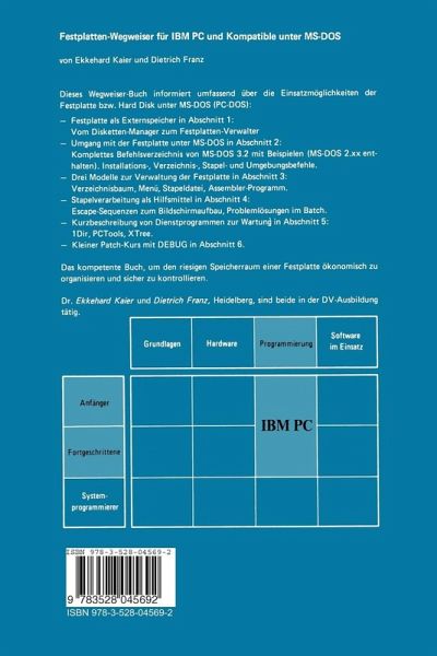 1 Festplatte als Externspeicher.- 1.1 Personalcomputer (PC) als Computertyp.- 1.2 Vom Disketten-Manager zum Festplatten-Verwalter.- 1.3 Vier Typen von Festplatten.- 1.4 Kleine Festplatten-Technologie.- 2 Umgang mit der Festplatte unter MS-DOS.- 2.1 Befehle ab MS-DOS 3.2 in alphabetischer Ordnung.- 2.2 Befehle zum Einrichten und Sichern der Festplatte.- 2.2.1 Festplatte einrichten.- 2.2.1.1 Unformatierte Festplatte.- 2.2.1.2 Vorformatierte Festplatte.- 2.2.1.3 Festplatte mit mehreren Partitions.- 2.2.1.4 Installation von MS-DOS im systemgeführten Dialog.- 2.2.2 Datensicherung der Festplatte.- 2.2.2.1 Datensicherung auf Disketten.- 2.2.2.2 Datensicherungs-Systeme.- 2.3 Verzeichnisbefehle.- 2.3.1 Verzeichnis mit Baumstruktur anlegen.- 2.3.2 Zugriffspfad festlegen.- 2.3.3 Verzeichnisse und Dateien kopieren.- 2.4 Stapelverarbeitungsbefehle.- 2.4.1 Stapeldatei erstellen, ausführen und anzeigen.- 2.4.2 Stapeldatei mit auswechselbaren Parametern.- 2.5 Umgebungsbefehle.- 2.5.1 Aktuelles Verzeichnis als Umgebungselement.- 2.5.2 Konfigurationsbefehle.- 2.5.2.1 Konfigurieren beim Systemstart.- 2.5.2.2 Konfigurationsdatei CONFIG.SYS in elementarer Form.- 2.5.2.3 Anpassungsdatei AUTOEXEC.BAT in elementarer Form.- 2.5.3 Umgebungsvariablen.- 2.5.3.1 Von MS-DOS in die Umgebung eingefügte Variablen.- 2.5.3.2 Vom Benutzer definierte Umgebungsvariablen.- 2.5.4 Filterbefehle.- 2.5.5 Umleitung der Ein-/Ausgabe.- 2.5.5.1 Umleitung.- 2.5.5.2 Umleitung und Pipe (Datenübergabe).- 3 Drei Modelle zur Verwaltung der Festplatte.- 3.1 Modell 1: Elementares System mit Unterverzeichnissen.- 3.1.1 Diskette simuliert Festplatte.- 3.1.1.1 Schritt 1: Bootfähige Diskette formatieren.- 3.1.1.2 Schritt 2: Unterverzeichnisse in den Ebenen 2 bis 4 anlegen.- 3.1.1.3.Schritt 3: Stapeldateien in das Stammverzeichnis eingeben.- 3.1.1.4.Schritt 4: Dateien in die Verzeichnisse kopieren.- 3.1.2 Festplatte organisieren.- 3.1.2.1 Schritt 1: Bootfähige Festplatte einrichten.- 3.1.2.2 Schritt 2: Unterverzeichnisse in den Ebenen 2 bis 4 anlegen.- 3.1.2.3 Schritt 3: Stapeldateien in das Stammverzeichnis eingeben.- 3.1.2.4 Schritt 4: Dateien in die Verzeichnisse kopieren.- 3.2 Modell 2: Menüorientiertes System mit Stapeldateien.- 3.2.1 Schritt 1: Bootfähige Festplatte einrichten.- 3.2.2 Schritt 2: Unterverzeichnisse in den Ebenen 2 bis 4 anlegen.- 3.2.3 Schritt 3: Stapeldateien in das Stammverzeichnis eingeben.- 3.2.3.1 Konfigurationsdatei CONFIG.SYS eingeben.- 3.2.3.2 Anpassungsdatei AUTOEXEC.BAT eingeben.- 3.2.4 Schritt 4: Dateien in die Verzeichnisse kopieren.- 3.2.5 Schritt 5: Menü bereitstellen.- 3.2.5.1 Textdatei MENU.TXT.- 3.2.5.2 Stapeldatei MENU.BAT.- 3.2.6 Schritt 6: Stapeldateien für die jeweilige Menüwahl eingeben.- 3.2.6.1 Speicherung der Stapeldateien.- 3.2.6.2 Starten eines Werkzeugs ohne RAM-Disk.- 3.2.6.3 Starten eines Werkzeugs mit RAM-Disk.- 3.3 Modell 3: Menüorientiertes System mit Assembler-Unterprogrammen.- 3.3.1 Schritt 1: Bootfähige Festplatte einrichten.- 3.3.2 Schritt 2: Unterverzeichnisse in den Ebenen 2 bis 4 anlegen.- 3.3.3 Schritt 3: Konfigurationsdatei CONFIG.SYS einrichten.- 3.3.4 Schritt 4: Stapeldateien einrichten.- 3.3.5 Schritt 5: Menü bereitstellen.- 3.3.5.1 Textdatei MENU.TXT.- 3.3.5.2 Stapeldatei MENU.BAT.- 3.3.5.3 Programm MENUKEYS.EXE.- 3.3.6 Schritt 6: Einfügen von Untermenüs.- 3.3.6.1 Datei MENU.TXT im Unterverzeichnis \HILFE\UTIL.- 3.3.6.2 Datei MENU.BAT im Unterverzeichnis \HILFE\UTIL.- 4 Stapelverarbeitung als Hilfsmittel.- 4.1 Programmierung von Stapeldateien.- 4.1.1 Allgemeine Programmiertips.- 4.1.2 Ausgewählte Beispiele.- 4.1.2.1 Umgebungsvariablen ansprechen.- 4.1.2.2 Eingabe von Parametern abfragen.- 4.1.2.3 Parameter beim Stapelaufruf trennen.- 4.1.2.4 FOR innerhalb und außerhalb des Stapels einsetzen.- 4.1.2.5 Stapeldateien verketten.- 4.2 Escape-Sequenzen.- 4.2.1 Systemanfragen erzeugen.- 4.2.1.1 Systemanfrage links unten.- 4.2.1.2 Systemanfrage rechts oben.- 4.2.2 Zeichenattribute setzen.- 4.2.2.1 DISKCOPY un