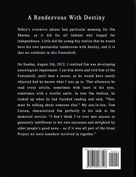 Nehru's evocative phrase had particular meaning for Om Sharma, as it did for all Indians who longed for Independence. Little did the young boy realize that he would have his own spectacular rendezvous with destiny, and it is that we celebrate in this Festschrift. On Sunday, August 5th, 2012, I realized Om was developing neurological impairment. I sat him down and told him of the Festschrift, until then a secret, as he would have surely objected had he known what I was up to. That afternoon he read every article, sometimes with tears in his eyes, sometimes with a wistful smile. In true Om fashion, he looked up when he had finished reading and said, "They must be talking about someone else." My son-in-law, Tom Carson, characterized Om perfectly in his talk at the memorial service: "I don't think I've ever met anyone so genuinely indifferent to his own successes and delighted by other people's good news - as if it was all part of the Great Project we were somehow involved in together."