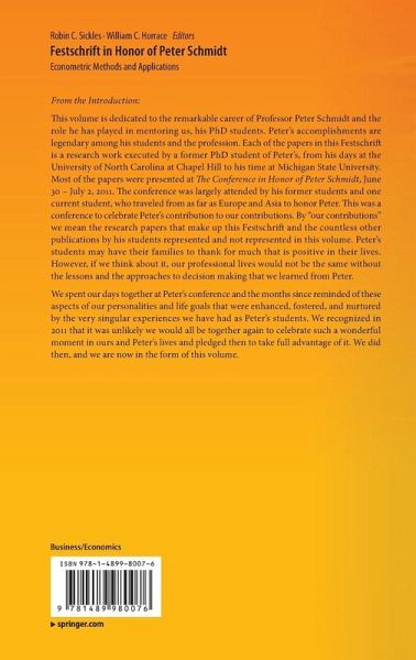 This volume is dedicated to the remarkable career of Professor Peter Schmidt and the role he has played in mentoring us, his PhD students. Peter's accomplishments are legendary among his students and the profession. Each of the papers in this Festschrift is a research work executed by a former PhD student of Peter's, from his days at the University of North Carolina at Chapel Hill to his time at Michigan State University. Most of the papers were presented at The Conference in Honor of Peter Schmidt, June 30 - July 2, 2011. The conference was largely attended by his former students and one current student, who traveled from as far as Europe and Asia to honor Peter. This was a conference to celebrate Peter's contribution to our contributions. By "our contributions" we mean the research papers that make up this Festschrift and the countless other publications by his students represented and not represented in this volume. Peter's studentsmay have their families to thank for much that is positive in their lives. However, if we think about it, our professional lives would not be the same without the lessons and the approaches to decision making that we learned from Peter.