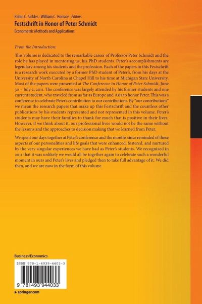This volume is dedicated to the remarkable career of Professor Peter Schmidt and the role he has played in mentoring us, his PhD students. Peter's accomplishments are legendary among his students and the profession. Each of the papers in this Festschrift is a research work executed by a former PhD student of Peter's, from his days at the University of North Carolina at Chapel Hill to his time at Michigan State University. Most of the papers were presented at The Conference in Honor of Peter Schmidt, June 30 - July 2, 2011. The conference was largely attended by his former students and one current student, who traveled from as far as Europe and Asia to honor Peter. This was a conference to celebrate Peter's contribution to our contributions. By "our contributions" we mean the research papers that make up this Festschrift and the countless other publications by his students represented and not represented in this volume. Peter's studentsmay have their families to thank for much that is positive in their lives. However, if we think about it, our professional lives would not be the same without the lessons and the approaches to decision making that we learned from Peter.