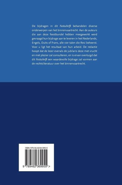 De bijdragen in dit Festschrift behandelen diverse onderwerpen van het binnenvaartrecht. Aan de auteurs die aan deze feestbundel hebben meegewerkt werd gevraagd hun bijdrage aan te leveren in het Nederlands, Engels, Duits of Frans, alle vier talen die Resi beheerst. Voor u ligt het resultaat van hun arbeid. De redactie hoopt dat de lezer evenals de jubilaris deze met vrucht en met plezier zal consulteren, en is ervan overtuigd dat dit Festschrift een waardevolle bijdrage zal vormen aan de rechtsliteratuur over het binnenvaartrecht.
