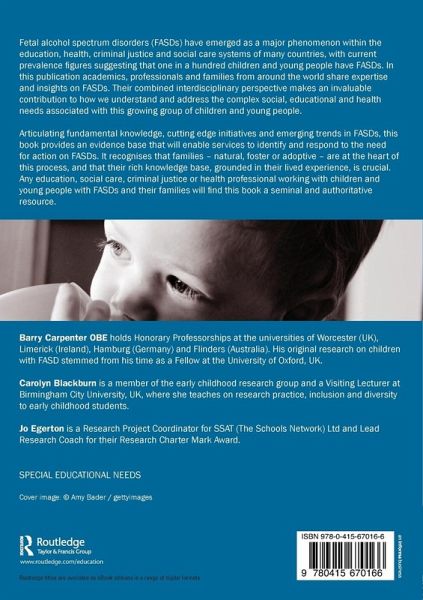 Fetal alcohol spectrum disorders (FASDs) have emerged as a major phenomenon within the education, health, criminal justice and social care systems of many countries, with current prevalence figures suggesting that one in a hundred children and young people have FASDs. In this publication, academics, professionals and families from around the world have shared expertise and insights on FASDs. Their combined interdisciplinary perspective makes an invaluable contribution to how we understand and address the complex social, educational and health needs associated with this growing group of children and young people. Articulating fundamental knowledge, cutting edge initiatives and emerging trends in FASDs, this book provides an evidence base that will enable services to identify and respond to the need for action on FASDs. It recognises that families - natural, foster or adoptive - are at the heart of this process, and that their rich knowledge base, grounded in their lived experience, is crucial. Any education, social care, criminal justice or health professional working with children and young people with FASDs and their families will find this book a seminal and authoritative resource.