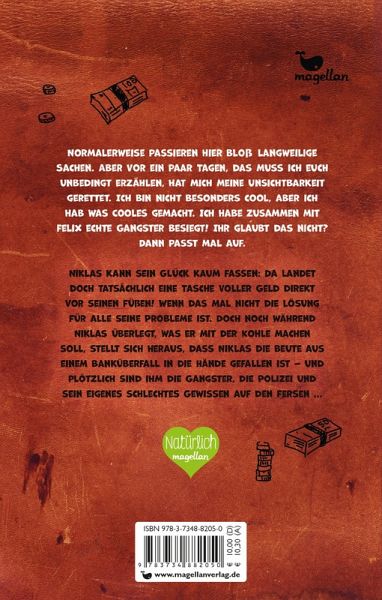 Niklas kann sein Glück kaum fassen: Da landet doch tatsächlich eine Tasche voller Geld direkt vor seinen Füßen! Wenn das mal nicht die Antwort auf alle seine Probleme ist. Aber noch während er überlegt, was er mit der Kohle machen soll, stellt sich heraus, dass Niklas die Beute aus einem Banküberfall in die Hände gefallen ist - und plötzlich sind ihm die Gangster, die Polizei und sein eigenes schlechtes Gewissen auf den Fersen ... Eine wilde Verfolgungsjagd durch Berlin, ein Bankraub und eine Tasche voller Geld - das ist der Stoff, aus dem spannungsgeladene Kinderbuchkrimis ab 10 Jahren gemacht sind, die (nicht nur) Jungs begeistern.