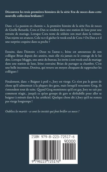 Découvrez les trois premières histoires de la série Feu de noces dans cette nouvelle collection brûlante ! Dans « La passion en chemin », la première histoire de la série Feu de noces de Giselle Renarde, Cora et Dan se rendent dans une station de luxe pour une retraite de mariage. Lorsque Cora tente de séduire son mari dans la voiture, Dan rejette ses avances. Cela va-t-il gâcher le week-end de Cora ? Ou Dan a-t-il une surprise coquine dans sa poche ? Ensuite, dans l'histoire « Deux tu l'auras », Irène est amoureuse de son collègue Brian depuis des années, mais elle n'a jamais eu le courage de le lui dire. Lorsque Maggie, une amie du bureau, les invite à son week-end de mariage dans une station de luxe, Irène convainc Brian de partager sa chambre. C'est une belle inconnue, Denitsa, qui trouve un moyen choquant de rapprocher les collègues ! Finalement, dans « Baigner à poil », Joey est vierge. Ce n'est pas le genre de chose qu'il admettrait à la plupart des gens, mais lorsqu'il rencontre Greg, ils s'entendent tout de suite. Quand Greg mentionne qu'il est gay, Joey ne sait pas comment réagir... jusqu'à ce qu'un groupe de gars se déshabille pour aller se baigner à minuit dans le lac artificiel. Quelque chose dit à Joey qu'il ne restera pas vierge longtemps ! Oubliez les mariés - ce sont les invités qui font briller ces noces !