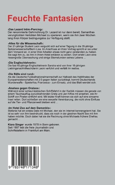 Sechs meisterlich erzählte erotische Geschichten von Bestsellerautorin Kiara Singer entführen ihre Leser in die geheimnisvolle Welt der Dominanz und Unterwerfung, der Demütigung, Züchtigung und Hingabe: 1. Das Lezard Intim-Piercing: Der renommierte Gehirnchirurg Dr. Lezard ist nur dann bereit, Samanthas verunglückten Verlobten Michael zu operieren, wenn sie ihm zwei Wochen lang ihren Körper bedingungslos zur Verfügung stellt. 2. Alles für die Wissenschaft: Der 21-jährige Student Leon verguckt sich auf einer Tagung in die 35-jährige Spitzenwissenschaftlerin Lisa. Im Anschluss an ihren Vortrag spricht er sie unter dem Vorwand an, in einer ihrer Arbeiten etwas nicht ganz verstanden zu haben. Sie sagt ihm zu, es ihm in ihrem Hotel erklären zu wollen. Dort erlebt Leon eine riesengroße Überraschung und einige Sternstunden seines Lebens ... 3. Die Englischlehrerin: Die fast 40-jährige Englischlehrerin Sandra wird von ihrer 18-jährigen Lieblingsnachhilfeschülerin Leoni verführt und verfällt ihr restlos. 4. Die Bälle sind rund. Die erotischen Geständnisse einer Spielerfrau: Als die deutsche Fußballnationalmannschaft zur Halbzeit des Halbfinales der Europameisterschaften mit 2:0 gegen Italien zurückliegt, kommt Deutschlands Wunderwaffe - Spielerfrau Francesca - zum Einsatz, und das Blatt wendet sich. 5. Analsex gegen Oralsex: Während einer schwul-lesbischen Schiffsfahrt in der Karibik müssen die gerade von einem Tauchausflug zurückkehrenden Greta und Jan hilflos mit ansehen, wie ihr Schiff von Piraten entführt wird. Mit letzter Kraft können sie sich auf eine einsame Insel retten. Dort schließen sie eine sexuelle Vereinbarung, die nicht ohne Einfluss auf die Tier- und Pflanzenwelt bleiben wird ... 6. Im Hotel Zoo auf dem Damenklo: Stefanie hat ein erstes Date mit Michael, den sie im Internet kennengelernt hat. Sie ist so sehr von ihm beeindruckt, dass sie noch in der gleichen Nacht Sex mit ihm haben möchte. Doch dabei hat sie die Rechnung ohne Michaels frühereEhefrau gemacht ...
