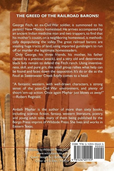 THE GREED OF THE RAILROAD BARONS! George Fitch, an ex-Civil War soldier, is summoned to his parents' New Mexico homestead. He arrives accompanied by an ancient Indian medicine man and two trappers, to find that his mother's cousin, on a neighboring homestead, is methodically depopulating the valley. The great railroad barons are stealing huge tracts of land, using imported gunslingers to run off or murder the legitimate homesteaders. Only George, his three friends, his mother, his father (lamed by a previous attack), and a very old and determined black lady remain to defend the Fitch ranch. Using inventiveness, skill, and pure grit, this small group rallies what help can be found and faces down the opposition. It's do or die as the Feud at Sweetwater Creek finally comes to a head. "A fantastic western, with well-drawn characters, a strong sense of the post-Civil War environment, and plenty of shoot-'em-up action. Once again Mayhar just blows us away!" -- Robert Reginald. Ardath Mayhar is the author of more than sixty books, including science fiction, fantasy, western literature, poetry, and young adult tales, many of them being published by the Borgo Press imprint of Wildside Press. She lives and works in Eastern Texas.