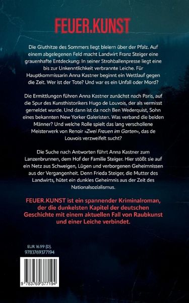 Die Gluthitze des Sommers liegt bleiern über der Pfalz. Auf einem abgelegenen Feld macht Landwirt Franz Steiger eine grauenhafte Entdeckung: In seiner Strohballenpresse liegt eine bis zur Unkenntlichkeit verbrannte Leiche. Für Hauptkommissarin Anna Kastner beginnt ein Wettlauf gegen die Zeit. Wer ist der Tote? Und war es ein Unfall oder Mord? Die Ermittlungen führen Anna Kastner zunächst nach Paris, auf die Spur des Kunsthistorikers Hugo de Louvois, der als vermisst gemeldet wurde. Und dann ist da noch Ben Wederquist, Sohn eines bekannten New Yorker Galeristen. Was verband die beiden Männer? Und welche Rolle spielt ein lang verschollenes Meisterwerk von Renoir, Zwei Frauen im Garten, das de Louvois verzweifelt sucht? Die Suche nach Antworten führt Anna Kastner zum Lanzenbrunnen, dem Hof der Familie Steiger. Hier stößt sie auf ein Netz aus Schweigen, Lügen und verborgenen Geheimnissen aus der Vergangenheit. Denn Frieda Steiger, die Mutter des Landwirts, hütet ein dunkles Geheimnis aus der Zeit des Nationalsozialismus. "Feuer.Kunst" ist ein spannender Kriminalroman, der die dunkelsten Kapitel der deutschen Geschichte mit einem aktuellen Fall von Raubkunst und einer Leiche verbindet.