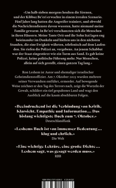 Leshem, international bekannter Autor («Euphoria», «Beaufort»), Journalist und ehemaliger israelischer Geheimdienstoffizier, ist auch persönlich betroffen. Die Hamas ermordete seinen Onkel und seine Tante, verschleppte seinen Cousin, der auch deutscher Staatsbürger war, als Geisel. Ein Blick in die Wirklichkeit Israels, der uns das Land auf sehr persönliche Weise nahebringt und zugleich ein großes Bild vermittelt. Das Buch zur Stunde, das den Konflikt begreifbar macht.