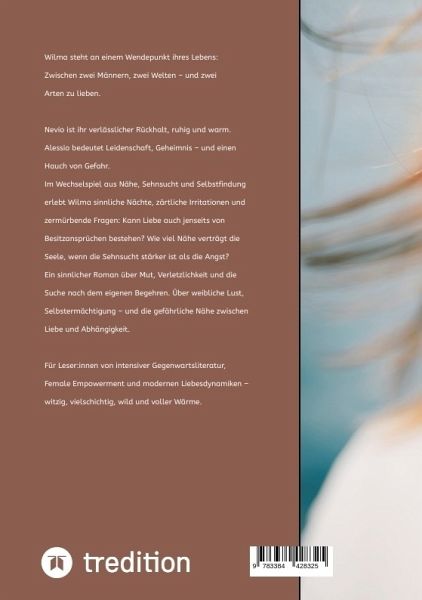 Wilma steht an einem Wendepunkt ihres Lebens: Zwischen zwei Männern, zwei Welten - und zwei Arten zu lieben. Nevio ist ihr verlässlicher Rückhalt, ruhig und warm. Alessio bedeutet Leidenschaft, Geheimnis - und ein Hauch von Gefahr.Im Wechselspiel aus Nähe, Sehnsucht und Selbstfindung erlebt Wilma sinnliche Nächte, zärtliche Irritationen und zermürbende Fragen: Kann Liebe auch jenseits von Besitzansprüchen bestehen? Und wie viel Nähe verträgt die Seele, wenn die Sehnsucht stärker ist als die Angst?Ein sinnlicher Roman über Mut, Verletzlichkeit und die Suche nach dem eigenen Begehren. Über weibliche Lust, Selbstermächtigung - und die gefährliche Nähe zwischen Liebe und Abhängigkeit. Für Leser:innen von intensiver Gegenwartsliteratur, Female Empowerment und modernen Liebesdynamiken - witzig, vielschichtig, wild und voller Wärme.