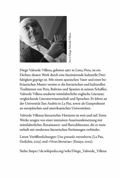 Diego Valverde Villena, geboren am 6. April 1967 in Lima, Peru, ist ein Dichter, dessen Werk durch eine faszinierende kulturelle Dreifaltigkeit geprägt ist. Mit einem spanischen Vater und einer bolivianischen Mutter vereint er die literarischen und kulturellen Traditionen von Peru, Bolivien und Spanien in seinem Schaffen. Valverde Villena studierte mittelalterliche englische Literatur, vergleichende Literaturwissenschaft und Sprachen an verschiedenen renommierten europäischen Universitäten. Er lehrte an der staatlichen Universität San Andrés in La Paz, Bolivien, sowie als Gastprofessor an mehreren europäischen und amerikanischen Universitäten. Valverde Villenas literarischer Horizont ist weit und tief. Seine Werke zeugen von einer intensiven Auseinandersetzung mit mittelalterlicher, Renaissance- und Barockliteratur, die er meisterhaft mit modernen literarischen Strömungen verbindet. Seine Gedichte sind beeinflusst von Größen wie Walther von der Vogelweide, Juan de la Cruz, John Donne und vielen anderen, die die Brücke zwischen verschiedenen Epochen und Kulturen schlagen. Zu seinen bedeutendsten Gedichtbänden gehören "El difícil ejercicio del olvido" (La Paz, 1997), "No olvides mi rostro" (Madrid, 2001), "El espejo que lleva mi nombre es crito" (Kairo, 2006), "Shir Hashirim" (Madrid, 2006), "Un segundo de vacilación" (La Paz, 2011), "Panteras" (Madrid, 2015) und "Una granada entreabierta" (La Paz, 2023). Darüber hinaus hat er bedeutende Übersetzungen von Autoren wie Conan Doyle, Rudyard Kipling, George Herbert, John Donne, Valery Larbaud, Ennio Flaiano, Fernando Assis Pacheco, E.T.A. Hoffmann und Paul Celan vorgelegt. Seine Essays wie "Varado entre murallas y gaviotas. Seis entradas en la bitácora de Maqroll el Gaviero" (2011), "Dominios inventados" (2013) und "Vetas literarias" (2022) ergänzen sein vielseitiges literarisches Schaffen. Mit seiner Fähigkeit, in wenigen Zeilen große emotionale und intellektuelle Tiefe zu erzeugen, gilt Diego Valverde Villena als einer der bedeutendsten lebenden Lyriker Spaniens.