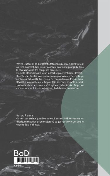 Vertes, les feuilles se mordorent sitôt que brâme le cerf. Elles valsent au vent, s'ancrent dans le sol, fécondent son ventre pour jaillir dans la sève visqueuse des bourgeons printaniers.Eternelle ritournelle où la vie et la mort se procréent mutuellement.Blanches, les feuilles s'encrent de poésie pour enfanter des mots qui enchantent la banalité des choses. En chacun de nous dort un rêveur. Réveillé, il émoustille notre langue. Elle se colore, s'envole au vent, s'enfonce dans les coeurs d'où giclent mille émois. Trop peu composent avec lui, laissant aux vers l'art de nous décomposer.