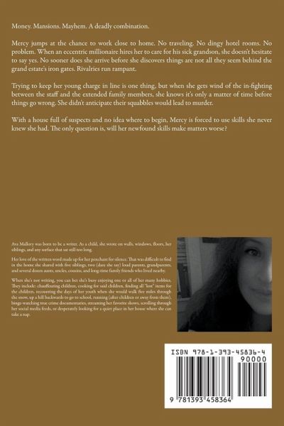 Money. Mansions. Mayhem. A deadly combination. Mercy jumps at the chance to work close to home. No traveling. No dingy hotel rooms. No problem. When an eccentric millionaire hires her to care for his sick grandson, she doesn't hesitate to say yes. No sooner does she arrive before she discovers things are not all they seem behind the grand estate's iron gates. Rivalries run rampant. Trying to keep her young charge in line is one thing, but when she gets wind of the in-fighting between the staff and the extended family members, she knows it's only a matter of time before things go wrong. She didn't anticipate their squabbles would lead to murder. With a house full of suspects and no idea where to begin, Mercy is forced to use skills she never knew she had. The only question is, will her newfound skills make matters worse?