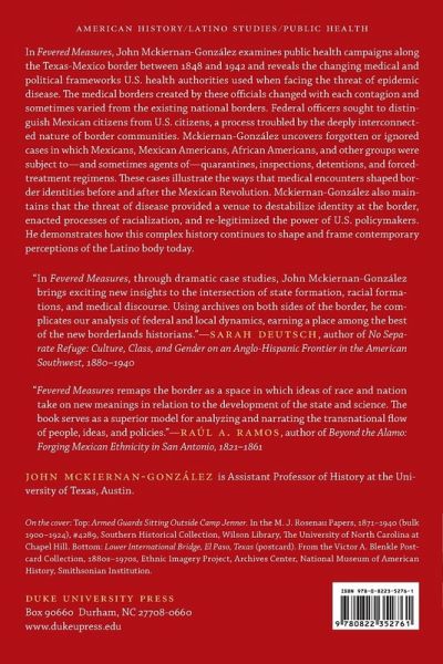 In Fevered Measures, John Mckiernan-González examines public health campaigns along the Texas-Mexico border between 1848 and 1942 and reveals the changing medical and political frameworks U.S. health authorities used when facing the threat of epidemic disease. The medical borders created by these officials changed with each contagion and sometimes varied from the existing national borders. Federal officers sought to distinguish Mexican citizens from U.S. citizens, a process troubled by the deeply interconnected nature of border communities. Mckiernan-González uncovers forgotten or ignored cases in which Mexicans, Mexican Americans, African Americans, and other groups were subject to-and sometimes agents of-quarantines, inspections, detentions, and forced-treatment regimens. These cases illustrate the ways that medical encounters shaped border identities before and after the Mexican Revolution. Mckiernan-González also maintains that the threat of disease provided a venue to destabilize identity at the border, enacted processes of racialization, and re-legitimized the power of U.S. policymakers. He demonstrates how this complex history continues to shape and frame contemporary perceptions of the Latino body today.