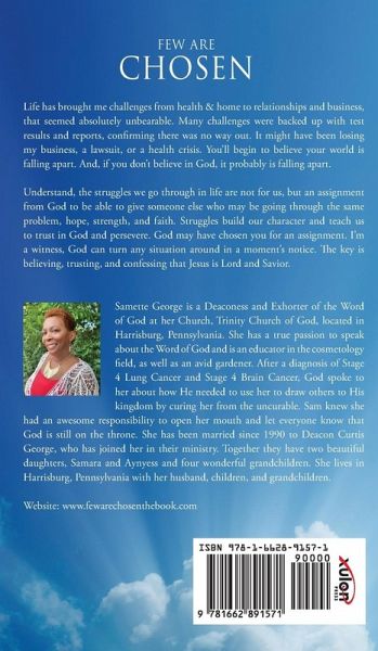 Life has brought me challenges from health & home to relationships and business, that seemed absolutely unbearable. Many challenges were backed up with test results and reports, confirming there was no way out. It might have been losing my business, a lawsuit, or a health crisis. You'll begin to believe your world is falling apart. And, if you don't believe in God, it probably is falling apart. Understand, the struggles we go through in life are not for us, but an assignment from God to be able to give someone else who may be going through the same problem, hope, strength, and faith. Struggles build our character and teach us to trust in God and persevere. God may have chosen you for an assignment. I'm a witness, God can turn any situation around in a moment's notice. The key is believing, trusting, and confessing that Jesus is Lord and Savior. Samette George is a Deaconess and Exhorter of the Word of God at her Church, Trinity Church of God, located in Harrisburg, Pennsylvania. She has a true passion to speak about the Word of God and is an educator in the cosmetology field, as well as an avid gardener. After a diagnosis of Stage 4 Lung Cancer and Stage 4 Brain Cancer, God spoke to her about how He needed to use her to draw others to His kingdom by curing her from the uncurable. Sam knew she had an awesome responsibility to open her mouth and let everyone know that God is still on the throne. She has been married since 1990 to Deacon Curtis George, who has joined her in their ministry. Together they have two beautiful daughters, Samara and Aynyess and four wonderful grandchildren. She lives in Harrisburg, Pennsylvania with her husband, children, and grandchildren. Website: www.fewarechosenthebook.com