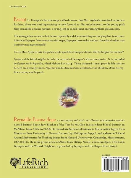Except for Feyespers favorite soup, caldo de arroz, that Mrs. Ayebeeb promised to prepare for him, there was nothing exciting to look forward to. But unbeknownst to the young pink fairy armadillo and his mother, a young jerboa is hell-bent on ruining their pleasant day. The young jerboa comes to their house repeatedly and does something so annoying that, in no time, infuriates Feyesper. Now overcome with anger, Feyesper turns to his mother. But what she does next is simply incomprehensible! To see Mrs. Ayebeeb take the jerboas side squelches Feyespers heart. Will he forgive his mother? Feyesper and the Wicked Neighbor is only the second of Feyespers adventure stories. It is preceded by Feyesper and the Rogue Kite, which debuted in 2014. These inspired stories provide life tools to benefit each young reader. Feyesper and his friends were created for the children of the twenty-first century and beyond.
