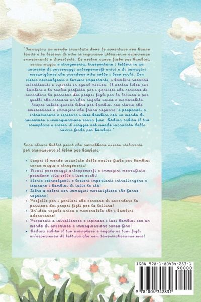 Immagina un mondo incantato dove le avventure non hanno limiti e le lezioni di vita si imparano attraverso esperienze emozionanti e divertenti. Le nostre nuove fiabe per bambini, senza magia e stregoneria, trasportano i lettori in un universo di personaggi antropomorfi unici e di immagini meravigliose che prendono vita sotto i loro occhi. ¿Con storie coinvolgenti e lezioni importanti, i bambini saranno intrattenuti e ispirati in egual misura. Il nostro libro per bambini è la scelta perfetta per i genitori che cercano di accendere la passione dei propri figli per la lettura e per quelli che cercano un'idea regalo unica e memorabile. Scopri subito questo libro per bambini con storie che emozionano e immagini che fanno sognare, e preparati a intrattenere e ispirare i tuoi bambini con un mondo di avventure e immaginazione senza fine. Ordina subito il tuo esemplare e inizia il viaggio nel mondo incantato delle nostre fiabe per bambini." Ecco alcuni bullet point che potrebbero essere utilizzati per promuovere il libro per bambini: Scopri il mondo incantato delle nostre fiabe per bambini senza magia e stregoneria! Vivaci personaggi antropomorfi e immagini mozzafiato prendono vita sotto i tuoi occhi! Storie coinvolgenti e lezioni importanti intrattengono e ispirano i bambini di tutte le età! Libro a colori con immagini meravigliose che fanno sognare! Perfetto per i genitori che cercano di accendere la passione dei propri figli per la lettura! Un'idea regalo unica e memorabile che i bambini adoreranno! Preparati a intrattenere e ispirare i tuoi bambini con un mondo di avventure e immaginazione senza fine! Ordina subito il tuo esemplare e regala ai tuoi figli un'esperienza di lettura che non dimenticheranno mai!