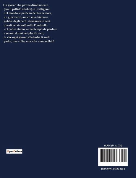Un giorno che piovea dirottamente, (era il pallido ottobre), e i valligiani del mondo si perdean dentro la mota, un giovinetto, amico mio, bizzarro gobbo, dagli occhi stranamente neri, questi versi cantò sotto l'ombrello: - O padre eterno, se hai tempo da perdere e se non dormi nei placidi cieli, tu che ogni giorno alla turba ti sveli, padre, una volta, una sola, a me svèlati!