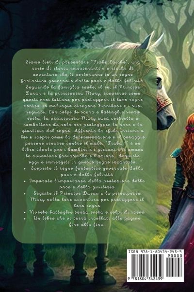 Siamo lieti di presentare "Fiabe Epiche", una serie di storia emozionanti e e ricche di avventure che ti porteranno in un regno fantastico governato dalla pace e dalla felicità. Seguendo la famiglia reale, il re, il Principe Duran e la principessa Mary, scoprirai come questi eroi lottano per proteggere il loro regno contro un malvagio Stregone Finnibuss e i suoi seguaci. Con colpi di scena e battaglie senza sosta, la principessa Mary sarà costretta a combattere da sola per proteggere la pace e la giustizia del regno. Affronta la sfida insieme a lei e scopri come la determinazione e il coraggio possono vincere contro il male. "Fiaba 1" è un libro ideale per i bambini e i giovani che amano le avventure fantastiche e l'azione. Acquista oggi e immergiti in questo regno incantato.