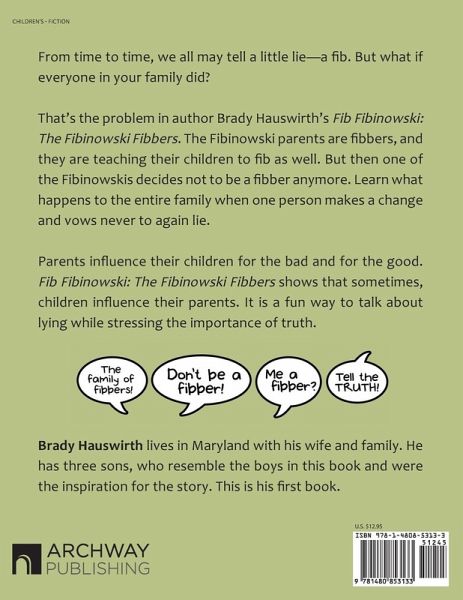 From time to time, we all may tell a little lie?a fib. But what if everyone in your family did? That?s the problem in author Brady Hauswirth?s Fib Fibinowski: The Fibinowski Fibbers. The Fibinowski parents are fibbers, and they are teaching their children to fib as well. But then one of the Fibinowskis decides not to be a fibber anymore. Learn what happens to the entire family when one person makes a change and vows never to again lie. Parents influence their children for the bad and for the good. Fib Fibinowski: The Fibinowski Fibbers shows that sometimes, children influence their parents. It is a fun way to talk about lying while stressing the importance of truth.