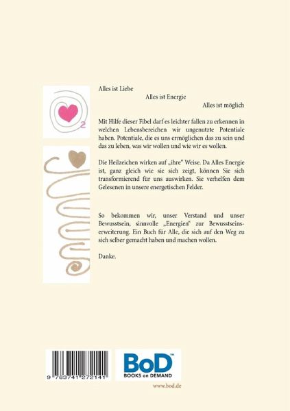 Die Inhalte dieses Buches dienen der persönlichen Selbstheilung, Selbstentwicklung und Bewusstseinserweiterung. Der Fokus liegt klar auf: "Erkenne den Sinn darin, Dein Leben zu leben".Viele Faktoren können eine Rolle spielen und uns am leben unseres eigenen Lebens hindern, indem sie einen Platz in unserem Leben einnehmen (bewusst und unbewusst), der im Grunde genommen, UNS selbst gebührt.Eventuell tendieren wir in erster Linie dazu, anderen zu helfen und zur Seite zu stehen, mehr als uns selbst. Wir vernachlässigen UNS.Die Heilzeichen nebst den Texten verhelfen uns zu sinnvoller Klarheit. Wir können unsere Potentiale erkennen und haben erneut die Wahl, uns für UNS und unser Leben zu entscheiden.Im gleichen Schritt können wir und alle anderen davon profitieren. Wir sind präsenter und klarer in unserer Ausrichtung.Wir leben uns.