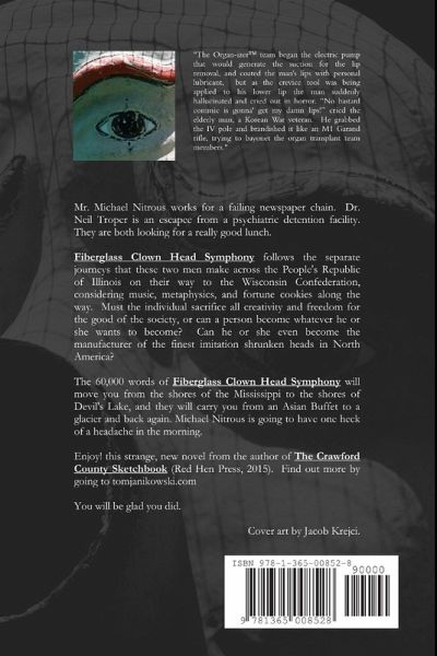 Mr. Michael Nitrous works for a failing newspaper chain. Dr. Neil Troper is an escapee from a psychiatric detention facility. They are both looking for a really good lunch. Fiberglass Clown Head Symphony follows the separate journeys that these two men make across the People's Republic of Illinois on their way to the Wisconsin Confederation, considering music, metaphysics, and fortune cookies along the way. Must the individual sacrifice all creativity and freedom for the good of the society, or can a person become whatever he or she wants to become? Can he or she even become the manufacturer of the finest imitation shrunken heads in North America? The 60,000 words of Fiberglass Clown Head Symphony will move you from the shores of the Mississippi to the shores of Devil's Lake, and they will carry you from an Asian Buffet to a glacier and back again. Michael Nitrous is going to have one heck of a headache in the morning.