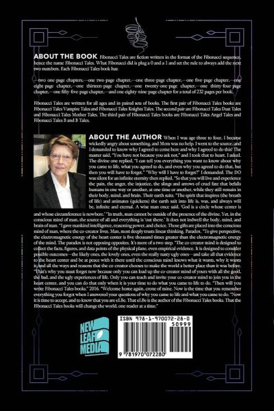 Fibonacci Tales are fiction written in the format of the Fibonacci sequence, hence the name Fibonacci Tales. What Fibonacci did is plug a 0 and a 1 and set the rule to always add the next two numbers. Each Fibonacci Tales book has: -two one-page chapters, -one two-page chapter, -one three-page chapter, -one five-page chapter, -one eight-page chapter, -one thirteen-page chapter, -one twenty-one-page chapter, -one thirty-four-page chapter, -one fifty-five-page chapter, -and one eighty-nine-page chapter for a total of 232 pages per book. Fibonacci Tales are written for all ages and in paired sets of books. The first pair of Fibonacci Tales books are Fibonacci Tales Vampire Tales and Fibonacci Tales Knights Tales. The second pair are Fibonacci Tales Dust Tales and Fibonacci Tales Mother Tales. The third pair of Fibonacci Tales books are Fibonacci Tales Angel Tales and Fibonacci Tales B and B Tales.