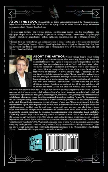 Fibonacci Tales are fiction written in the format of the Fibonacci sequence, hence the name Fibonacci Tales. What Fibonacci did is plug a 0 and a 1 and set the rule to always add the next two numbers. Each Fibonacci Tales book has: -two one-page chapters, -one two-page chapter, -one three-page chapter, -one five-page chapter, -one eight-page chapter, -one thirteen-page chapter, -one twenty-one-page chapter, -one thirty-four-page chapter, -one fifty-five-page chapter, -and one eighty-nine-page chapter for a total of 232 pages per book. Fibonacci Tales are written for all ages and in paired sets of books. The first pair of Fibonacci Tales books are Fibonacci Tales Vampire Tales and Fibonacci Tales Knights Tales. The second pair are Fibonacci Tales Dust Tales and Fibonacci Tales Mother Tales. The third pair of Fibonacci Tales books are Fibonacci Tales Angel Tales and Fibonacci Tales B and B Tales.