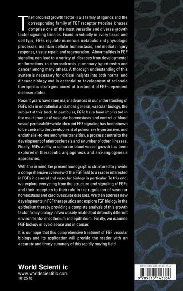 The fibroblast growth factor (FGF) family of ligands and the corresponding family of FGF receptor tyrosine kinases comprise one of the most versatile and diverse growth factor signaling families in vertebrates, found virtually in every tissue and cell type where they regulate metabolic and physiologic function, maintain tissue homeostasis, and mediate injury response, tissue repair, and regeneration. As a result, FGFs play critical roles in a wide variety of normal biological and abnormalities in FGF signaling can lead to a variety of disease states from developmental malformations, to atherosclerosis, pulmonary hypertension and cancer among many others. A thorough understanding of this system is necessary for critical insights into both normal and disease biology and is essential to development of rationale therapeutic strategies aimed at treatment of FGF-dependent diseases states. Recent years have seen advances in our understanding of FGFs role in endothelial and, more general, vascular biology, the subject of this book. In particular, FGFs have been implicated in the maintenance of vascular homeostasis and control of blood vessel permeability while aberrant FGF signaling has been shown to be central to the development of pulmonary hypertension, and endothelial-to-mesenchymal transition, a process implicated in the development of atherosclerosis. Finally, FGFs ability to stimulate blood vessel growth has been explored in therapeutic angiogenesis approaches. With this in mind, the present monograph is structured to provide comprehensive information to a reader interested in FGFs in general and vascular biology in particular. To this end, we explore everything from the structure and signaling of FGFs and their receptors (Chapters 1, 2 and 3) to their role in the regulation of vascular homeostasis (Chapter 4) and cardiovascular diseases (Chapters 5 and 6). We then address new developments in FGF therapeutics (chapter 7) and explore FGF biology in the epithelium (Chapter 8) thereby providing a complete analysis of this growth factor family biology in two closely related but distinctly different environments — endothelium and epithelium. Finally, we examine FGF biology in eye disease and in cancer. It is our hope that this comprehensive treatment of FGF vascular biology and its application will provide the reader with the accurate and timely summary of this rapidly moving field.