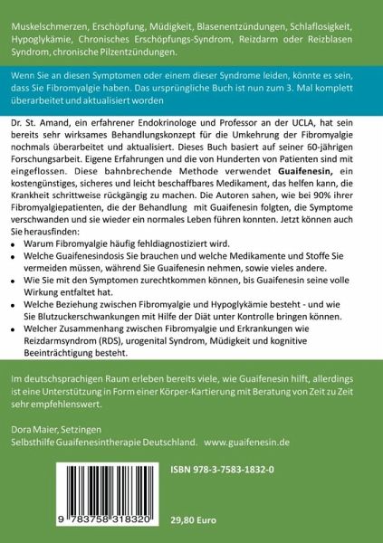 Muskelschmerzen, Erschöpfung, Müdigkeit, Blasenentzündungen, Schlaflosigkeit, Hypoglykämie, chronisches Erschöpfungs-Syndrom, Reizdarm- oder Reizblasen-Syndrom, chronische Pilzentzündungen: Wenn Sie an diesen Symptomen oder einem dieser Syndrome leiden, könnte es sein, dass Sie Fibromyalgie haben. Jetzt ist das revolutionäre Buch über die Therapie bei Fibromyalgie mit der 4. Auflage nochmals komplett überarbeitet und aktualisiert worden. Im Jahre 1999 stellte Dr. St. Amand, ein erfahrener Endokrinologe und Professor an einer kalifornischen Universität, sein effektives Behandlungskonzept vor, welches Fibromyalgie rückgängig machen kann - basierend auf vierzig Jahren der Forschung aufgrund seiner eigenen Erfahrungen mit der Krankheit sowie der von hunderten seiner Patienten. Jahre später sind tausende von Menschen, die an Fibromyalgie litten, dem revolutionären Konzept von Dr. St. Amand gefolgt und haben wunderbare Resultate erzielt. Dies Buch beinhaltet neueste Forschungsergebnisse bis zum Jahr 2019 sowie Dr. St. Amands bahnbrechendes Programm, welches Guaifenesin einsetzt - ein preisgünstiges, sicheres und zunehmend einfacher erhältliches Medikament, welches die Krankheit zum Guten wenden kann. Die Autoren sahen, wie bei 90% aller Fibromyalgiepatienten, die dem Behandlungskonzept folgten, die Symptome verschwanden und sie wieder ein normales Leben führen konnten. Jetzt können auch Sie herausfinden: - Warum Fibromyalgie häufig fehldiagnostiziert wird. - Nach welchen Richtlinien die korrekte Dosis und passende Form des Guaifenesins gefunden wird - und welche Substanzen dabei zu vermeiden sind. - Wie Sie mit den Symptomen zurechtkommen können, bis Guaifenesin seine volle Wirkung entfaltet hat. - Welcher Zusammenhang zwischen Fibromyalgie und Hypoglykämie besteht - und wie Sie Ihre Hypoglykämie mit Hilfe einer Diät unter Kontrolle bringen können. Aktuelle Informationen darüber, welche Zusammenhänge zwischen Fibromyalgie und solchen Leiden wie z.B. Reizdarm-Syndrom, Reizblasen-Syndrom und weiteren Beschwerden bestehen. Auch im deutschsprachigen Raum erleben bereits viele wie Guaifenesin hilft, allerdings ist eine Unterstützung in Form einer Körper-Kartierung mit Beratung von Zeit zu Zeit sehr empfehlenswert. Dora Maier, Setzingen Selbsthilfe Guaifenesin Deutschland, www.guaifenesin.de