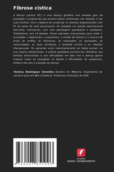 A fibrose quística (FC) é uma doença genética com elevado grau de gravidade e progressão que provoca danos emocionais nos doentes e nas suas famílias. Com o objetivo de caraterizar os doentes diagnosticados com FC do ponto de vista psicossocial, foi realizado um estudo observacional descritivo, transversal, com uma abordagem quantitativa e qualitativa. Trabalhámos com 14 doentes. Foram aplicados instrumentos para medir a ansiedade, a depressão, a autoestima, o estado da doença e a procura de áreas de conflito, os interesses, as motivações, as aspirações, as necessidades, os laços familiares, a atividade escolar e as relações interpessoais. Os pacientes eram maioritariamente em idade escolar, na sua maioria adolescentes. A análise qualitativa permitiu-nos identificar que famílias disfuncionais e com dificuldades em lidar com a doença geram maiores níveis de ansiedade no doente e dificuldades de autoestima, embora não com a evolução da doença.