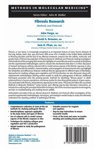 Leading investigators review the highlights of current fibrosis research and the experimental methodologies used uncover the mechanisms that drive it. In their discussion of research methodologies utilizing cultured cells to model various aspects of the fibrotic response in vitro, the authors describe the isolation, characterization, and propagation of mesenchymal cells, and highlight the similarities and differences between methods that are appropriate for different types of fibroblasts. Approaches for studying collagen gene regulation and TGF-b production are also discussed, along with experimental methodologies utilizing animal models to study the pathogenesis of fibrosis. The protocols follow the successful Methods in Molecular Medicine(TM) series format, each offering step-by-step laboratory instructions, an introduction outlining the principles behind the technique, lists of the necessary equipment and reagents, and tips on troubleshooting and avoiding known pitfalls.