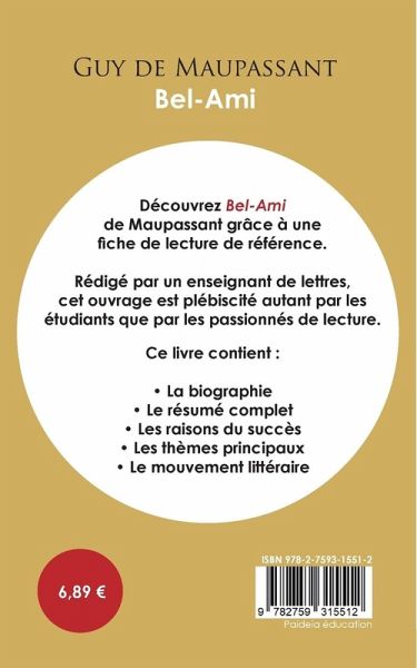 Décryptez Bel-Ami avec l'analyse de Paideia éducation ! Que faut-il retenir de ce roman de Maupassant ? Retrouvez tout ce que vous devez savoir de ce chef-d'¿uvre de la littérature française dans une analyse de référence pour comprendre rapidement le sens de l'¿uvre. Rédigée de manière claire et accessible par un enseignant, cette fiche de lecture propose notamment un résumé, une étude des thèmes principaux, des clés de lecture et des pistes de réflexion. Une analyse littéraire complète et détaillée pour mieux lire et comprendre le livre ! Paideia éducation en deux mots : Plébiscité aussi bien par les passionnés de littérature que par les lycéens, Paideia éducation est considéré comme une référence en matière d'analyses d'¿uvres littéraires. Celles-ci ont été conçues pour guider les lecteurs à travers la littérature. Nos auteurs appartiennent aux milieux universitaire et de l'éducation, gage de sérieux pour vous faire découvrir les plus grandes ¿uvres de la littérature mondiale.