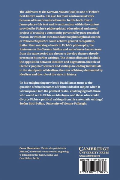 The Addresses to the German Nation (1808) is one of Fichte's best-known works. It is also his most controversial work because of its nationalist elements. In this book, David James places this text and its nationalism within the context provided by Fichte's philosophical, educational and moral project of creating a community governed by pure practical reason, in which his own foundational philosophical science or Wissenschaftslehre could achieve general recognition. Rather than marking a break in Fichte's philosophy, the Addresses to the German Nation and some lesser-known texts from the same period are shown to develop themes already present in his earlier writings. The themes discussed include the opposition between idealism and dogmatism, the role of Fichte's 'popular' lectures and writings in leading individuals to the standpoint of idealism, the view of history demanded by idealism and the role of the state in history.