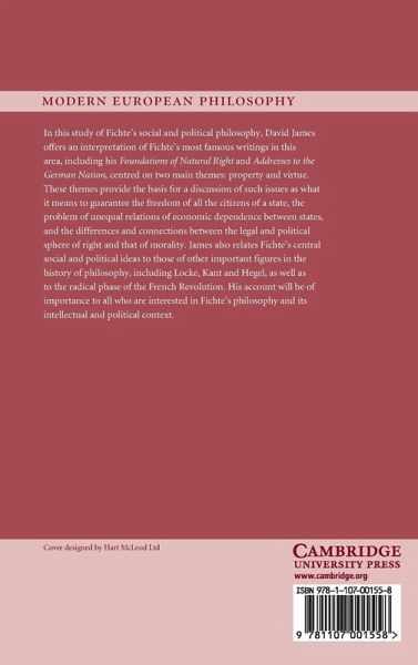 In this study of Fichte's social and political philosophy, David James offers an interpretation of Fichte's most famous writings in this area, including his Foundations of Natural Right and Addresses to the German Nation, centred on two main themes: property and virtue. These themes provide the basis for a discussion of such issues as what it means to guarantee the freedom of all the citizens of a state, the problem of unequal relations of economic dependence between states, and the differences and connections between the legal and political sphere of right and morality. James also relates Fichte's central social and political ideas to those of other important figures in the history of philosophy, including Locke, Kant and Hegel, as well as to the radical phase of the French Revolution. His account will be of importance to all who are interested in Fichte's philosophy and its intellectual and political context.