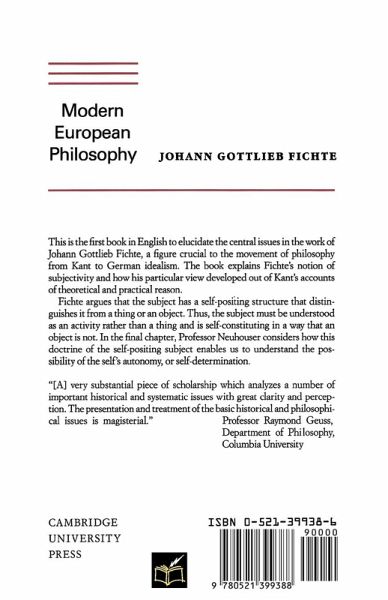 This is the first book in English to elucidate the central issues in the work of Johann Gottlieb Fichte, a figure crucial to the movement of philosophy from Kant to German idealism. The book explains Fichte's notion of subjectivity and how his particular view developed out of Kant's accounts of theoretical and practical reason.