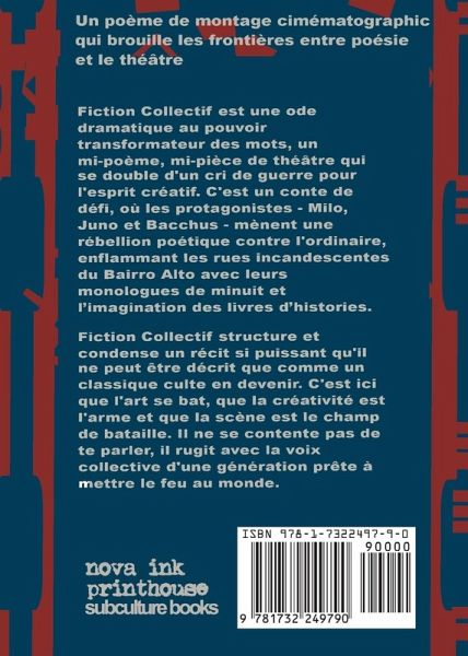 "Un poème en montage cinématographique qui brouille les frontières entre poésie et théâtre." Fiction Inc. (Fiction et Cie) est un récit coloré et onirique qui mêle théâtre, mythologie et poésie cinématographique. Au c¿ur de l'histoire se trouve Milo, un dramaturge sous un sortilège des dieux, qui se retrouve piégé entre les royaumes de la fiction et de la réalité. Aux côtés d'un casting de personnages excentriques, Milo et son entourage ressentent le poids du monde pour remplir leurs obligations envers l'Univers et le Théâtre Meta. Fiction Inc.est une ode dramatique au pouvoir transformateur des mots, à la fois poème et pièce de théâtre, qui fait office de cri de ralliement pour l'esprit créatif. C'est une histoire de défi, où les protagonistes-Milo, Juno, Bacchus et Sonny-mènent une rébellion poétique contre l'ordinaire, enflammant les rues incandescentes du Bairro Alto avec leurs monologues de minuit et leur imagination de conte de fées. Fiction Inc. texture et condense un récit si puissant qu'il ne peut être décrit que comme un classique culte en devenir. C'est ici que l'art riposte, où les mots sont l'arme et la scène est le champ de bataille. Il ne s'adresse pas qu'à toi; cela rugit avec la voix collective d'une génération prête à mettre le feu au monde. Fiction Inc. explore des thèmes de créativité, de rébellion et du pouvoir de l'imagination, en devenant un manifeste pour tous ceux qui osent être extraordinaires. C'est un incontournable pour les lecteurs de toutes générations partout.