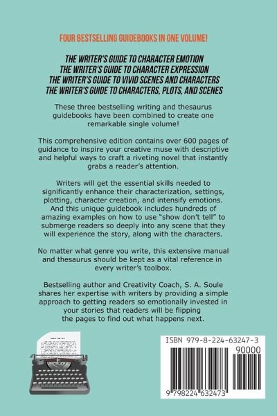 These four bestselling writing and thesaurus guides, "The Writer's Guide to Character Emotion," "The Writer's Guide to Character Expression," "The Writer's Guide to Vivid Settings and Characters," and "The Writer's Guide to Characters, Plots, and Scenes" have been combined to create one remarkable single volume! This comprehensive edition contains over 600 pages of guidance to inspire your creative muse with descriptive ways to craft a riveting novel that instantly grabs a reader's attention. Writers will get the essential skills needed to significantly enhance their characterization, settings, scenes, and intensify emotions. This unique guidebook includes hundreds of amazing examples on how to use "show don't tell" to submerge readers so deeply into the narrative that they will experience the story along with the characters. No matter what genre you write, this extensive manual and thesaurus should be kept as a vital reference in every writer's toolbox. Learn to craft: *Revise Shallow Writing *Deepen Characterization *Resolve Showing vs. Telling Issues *Craft Natural Character Expressions *Write realistic settings through sensory details *Create three-dimensional characters *3 Extensive Creation Character Templates *Tools to Create a Page-Turning First Chapter *Writing Scene Hooks *Advice from Bestselling Authors on Plotting Bestselling author and Creativity Coach, S. A. Soule shares her expertise with writers by providing a simple approach to getting readers so emotionally invested in your stories that readers will be flipping the pages to find out what happens next. Are you ready to take your writing skills to the next level? Then Start reading Today!