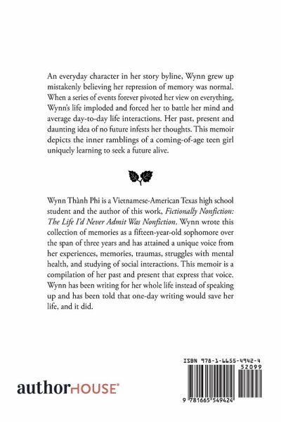 An everyday character in her story byline, Wynn grew up mistakenly believing her repression of memory was normal. When a series of events forever pivoted her view on everything, Wynn's life imploded and forced her to battle her mind and average day-to-day life interactions. Her past, present and daunting idea of no future infests her thoughts. This memoir depicts the inner ramblings of a coming-of-age teen girl uniquely learning to seek a future alive.