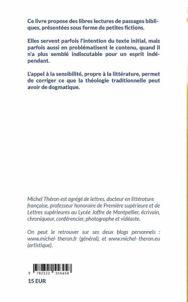 Ce livre propose des libres lectures de passages bibliques, présentées sous forme de petites fictions. Elles servent parfois l'intention du texte initial, mais parfois aussi en problématisent le contenu, quand il n'a plus semblé admissible pour un esprit indépendant. L'appel à la sensibilité, propre à la littérature, permet de corriger ce que la théologie traditionnelle peut avoir de dogmatique.