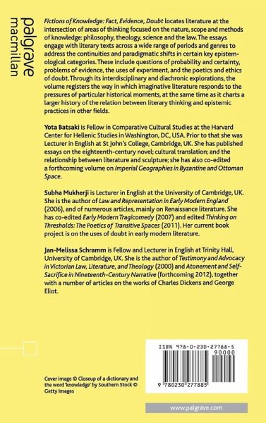 Locating literature at the intersection of distinct areas of thinking on the nature, scope and methods of knowledge - philosophy, theology, science, and the law - this book engages with literary texts across periods and genres to address questions of probability, problems of evidence, the uses of experiment and the poetics and ethics of doubt.