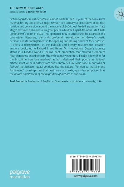 Fictions of Witness in the Confessio Amantis details the first years of the Confessio's material history and offers a major revision to a century's old narrative of political revision and conversion around the trauma of 1400. Joel Fredell argues for "late stage" revisions by Gower to his great poem in Middle English from the late 1390s up to Gower's death in 1408. This approach, new to scholarship for Ricardian and Lancastrian literature, demands profound re-evaluation of Gower's poetic persona and its entanglement in the opening and closing books of the Confessio. It offers a reassessment of the political and literary relationships between versions dedicated to Richard II and Henry IV. It repositions Gower's laureate status in a London world of deluxe book production that created a canon of Ricardian poets linked to their fifteenth-century inheritors. Finally, it identifies for the first time how late medieval authors designed their poetry as fictional artifacts that witnesshistory from quasi-chronicles like Maidstone's Concordia or Richard the Redeless, quasi-petitions like the Lollard "Petition to the King and Parliament," quasi-epistles that begin so many texts, quasi-transcripts such as the Record and Process of the Deposition of Richard II, and so on.