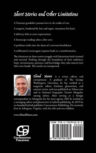 Short Stories and Other Limitations A Venetian gondolier pursues love in the midst of war. A surgeon, burdened by loss and regret, renounces his heart. A delivery fails to meet expectations. A horoscope reading takes a dire turn. A professor sinks into the abyss of a nervous breakdown. A millionaire's extravagant expense leads to a transformation. The characters in these stories struggle with limitations both internal and external. Pushing through the boundaries of their ambition, hope, circumstance, patience, and knowledge, they take matters into their own hands. The results are unexpected.