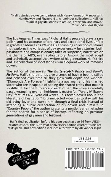 The Los Angeles Times says "Richard Hall's prose displays a rare polish, and his accounts of ordinary and exceptional lives unfold in graceful cadences." Fidelities is a stunning collection of stories that explores the varieties of gay experience - love stories, both passionate and compassionate; tales of suspense; narratives on the theme of AIDS; even a ghost story. Among the most adept and technically accomplished writers of his generation, Hall's third and last collection of short stories is an eloquent work of immense power. The author of the novels The Butterscotch Prince and Family Fictions, Hall's short stories give a sense of having been distilled and polished over time till they glow with depth and wisdom. "Diamonds Are Forever" highlights a gay man and his married sister who are incapable of seeing the shared traits that make it so difficult for them to accept each other; the story's carefully paced wrangling over an heirloom is masterful. "Avery Milbanke Day" features a 70-year-old writer - his seven novels about "the literature of hesitation" long neglected - decides to stay with his old dying lover and nurse him through a final crisis instead of attending a public celebration of his novels and himself. In "Country People" the author presents a gentle, eerie metaphor for the search for a sense of history, reflecting on previous generations of gay men and lesbians. Hall's final publication before his own death at age 66 from AIDS-related causes, this 30th year anniversary edition celebrates his art at its peak. This new edition includes a foreword by Alexander Inglis. ¿¿"[A] rich, poignant collection ... The ruminations in Fidelities are remarkably palpable, utterly believable. Enlivened by precise flourishes of description, they touch directly on the reader's empathy button, and hold." - San Francisco Chronicle "Many of these stories are light in tone and charming in manner, but the relentless presence of AIDS and its consequences animates them ... Hall excels at depicting how to go on." - Washington Post Book World "Hall's stories evoke comparison with Henry James or Maupassant, Hemingway and Fitzgerald ... A luminous collection ... Hall has found in gay life stories to amuse, entertain, and move." - Lambda Book Report "Hall writes ... in a measured, often moving voice that explores the difficulties of grief and commitment." - Kirkus Reviews "Hall shows again and again his fidelity to the gay male community at large. These stories are the work of an acknowledged master at the top of his form." - Bay Area Reporter "Beautifully controlled ... arresting ... insightful ... pungent ... diverse ... [and] keenly observed." - Publishers Weekly