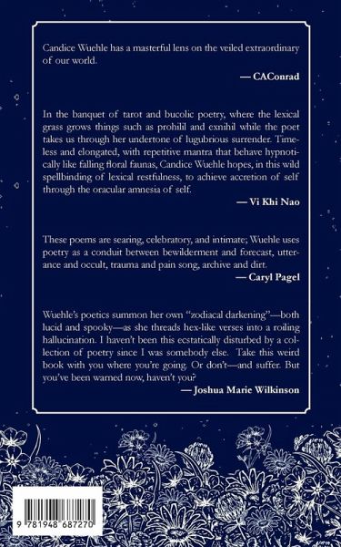 Fidelitoria: Fixed or Fluxed navigates interior landscapes, personal cosmology, and the manner in which language shapes our being and being shapes our language via acts of séance, tarot, alchemical interpretation, and psychoanalysis. These are poems written in the wild swing of the scrying stone, poems that ask how to create an identity in the way of perpetual change, constant self-interrogation, and ever shifting psychogeography. What does it mean to live in the orb of uncertainty? To be neither here nor there, neither fixed nor fluxed? Candice Wuehle is the author of the novel MONARCH (Soft Skull, forthcoming) as well as three collections of poetry, including FIDELITORIA: fixed or fluxed (11:11, 2021), Death Industrial Complex (Action Books, 2020) and BOUND (Inside the Castle Press, 2018). She has also written several chapbooks, including VIBE CHECK (Garden-door Press, 2018), EARTH*AIR*FIRE*WATER*ÆTHER (Grey Books Press, 2015) and cursewords: a guide in 19 steps for aspiring transmographs (Dancing Girl Press, 2014). Her work can be found in The Iowa Review, Best American Experimental Writing 2020, Black Warrior Review, Tarpaulin Sky, The Volta, The Colorado Review, SPORK, and The New Orleans Review. ¿ Candice holds an MA in literature from the University of Minnesota as well as an MFA in poetry from the Iowa Writers' Workshop. She recently earned a doctorate in Creative Writing at The University of Kansas, where she was the recipient of a Chancellor's Fellowship. Her studies focus on the relationship between trauma, memory and the occult. ¿ Originally from Iowa City, Iowa, Candice lives in Lawrence, Kansas with her husband Andrew and their rabbit, William the Bunny.