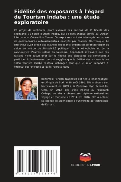 Ce projet de recherche pilote examine les raisons de la fidélité des exposants au salon Tourism Indaba, qui se tient chaque année au Durban International Convention Center. Dix exposants ont été interrogés au moyen de questionnaires auto-administrés envoyés par courrier électronique. Le chercheur avait prédit que d'autres exposants avaient cessé de participer au salon en raison de l'instabilité politique, de la xénophobie et de la concurrence d'autres salons du tourisme. Cependant, il s'avère que ces raisons n'ont aucun effet sur la fidélité des exposants qui continuent à participer à l'événement, ce qui suggère que la fidélité des exposants au salon Tourism Indaba restera inchangée tant que le salon répondra à l'objectif des entreprises qu'ils représentent.