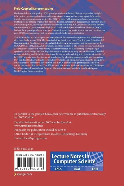 This State-of-the-Art-Survey provides a snapshot of the current developments and novel research directions in the area of FCN. The book is divided into five sections. The first part, Field-Coupled Nanocomputing Paradigms, provides valuable background information and perspectives on the QDCA, MQCA, NML, and AQCA paradigms and their evolution. The second section, Circuits and Architectures, addresses a wide variety of current research on FCN clocking strategies, logic synthesis, circuit design and test, logic-in-memory, hardware security, and architecture. The third section, Modeling and Simulation, considers the theoretical modeling and computer simulation of large FCN circuits, as well as the use of simulations for gleaning physical insight into elementary FCN building blocks. The fourth section, Irreversibility and Dissipation, considers the dissipative consequences of irreversible information loss in FCN circuits, their quantification, and their connection to circuit structure. The fifth section, The Road Ahead: Opportunities and Challenges, includes an edited transcript of the panel discussion that concluded the FCN 13 workshop.