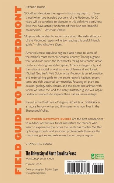America’s most populous region is also home to some of the nation’s most serenely beautiful country. Tracing a gentle, thousand-mile curve from New York City southwestward to Montgomery, Alabama, the Piedmont connects an arc of urban centers which includes five state capitals, America’s largest city, and the national capital. Between the Atlantic coastal plain and the Blue Ridge Mountains, the Piedmont’s rolling hills span miles of farmland and forest. Michael Godfrey’s Field Guide to the Piedmont — originally published by Sierra Club Books and here newly revised and updated — is an informative and entertaining guide to the entire region’s habitats, ecosystems, and rich botanical communities. Focusing on plant succession, geology, soils, climate, and the plants and animals with which we share the land, Field Guide to the Piedmont also features 180 illustrations for easy identification of the Piedmont’s principal flora and fauna. A chapter describing and providing directions to over fifty sites of special interest will inspire Piedmont residents to take this field guide in hand and explore their natural surroundings. Southern Gateways Guide is a registered trademark of the University of North Carolina Press