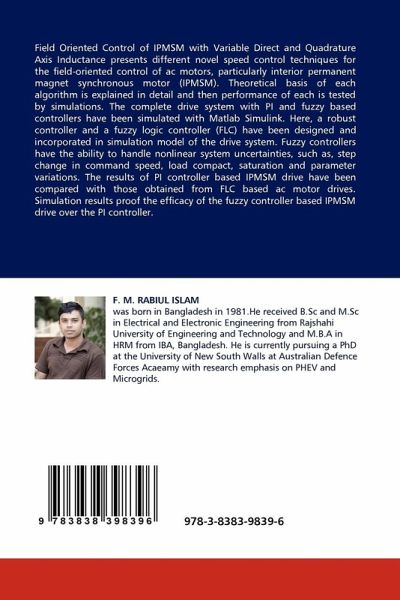 Field Oriented Control of IPMSM with Variable Direct and Quadrature Axis Inductance presents different novel speed control techniques for the field-oriented control of ac motors, particularly interior permanent magnet synchronous motor (IPMSM). Theoretical basis of each algorithm is explained in detail and then performance of each is tested by simulations. The complete drive system with PI and fuzzy based controllers have been simulated with Matlab Simulink. Here, a robust controller and a fuzzy logic controller (FLC) have been designed and incorporated in simulation model of the drive system. Fuzzy controllers have the ability to handle nonlinear system uncertainties, such as, step change in command speed, load compact, saturation and parameter variations. The results of PI controller based IPMSM drive have been compared with those obtained from FLC based ac motor drives. Simulation results proof the efficacy of the fuzzy controller based IPMSM drive over the PI controller.
