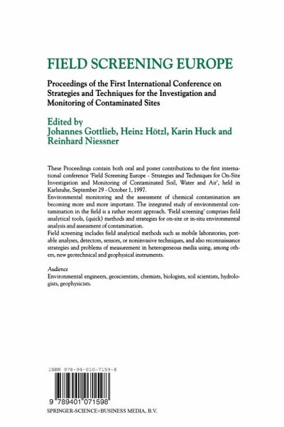 These Proceedings contain both oral and poster contributions to the first interna tional conference" Field Screening Europe - Strategies and Techniques for On-Site Investigation and Monitoring of Contaminated Soil, Water and Air", held in Karls ruhe September 29 - October 1, 1997. Environmental monitoring and the assessment of chemical contaminations are be coming more and more important. The integrated study of environmental con tamination in the field is a rather recent approach. "Field screening" indicates such field analytical tools, (quick) methods and strategies for on-site or in-situ environmental analysis and assessment of contamination. The classical strategy for investigating contaminants consists of the following steps: site studies, sampling, sample transport to the laboratory, sample preparation, and analysis. This strategy is rather expensive and time consuming. Some investiga tions, including sample preparation, may last several days. In many cases, the results must be available immediately and are of importance for further decisions. Field screening is an alternative or complement to this strategy that attempts to be cheaper and faster and may achieve the same quality of results. The most important argument for field analytical methods is that the superior accuracy and high costs of laboratory methods are disproportional to the possibility of arti facts from sampling and errors originating from spatial variations of contaminants.