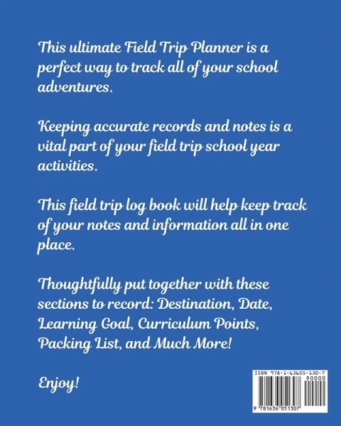 How to use this Field Trip Log Book: 8 X 10 Inches 110 Pages This useful field trip planner is a must-have for anyone that needs to record their school field trip activities! You will love this easy to use field trip log book to track and record all your school season activities. Each interior page includes space to record & track the following: Destination and Date - Record where the field trip destination will be taking place and the date of the activity. Learning Goal - Use this space to fill in the learning goal of the field trip. Contact Information - Record the contact information of each student. Curriculum Points - Fill in the points obtained to fulfill the curriculum requirements. Packing List - Stay on task by writing down what will be needed for this field trip. Preparation Study - Record any study required before the field trip is taken. What Happened/What Did I Learn - Write down in this space what took place on the field trip, and what lessons were learned. Notes - Extra note space to record any thoughts or observations from the field trip. If you are new to homeschooling or taking field trips for school, this field trip planning log book is a must have! Can make a great useful gift for anyone that loves to take field trips! Enjoy!